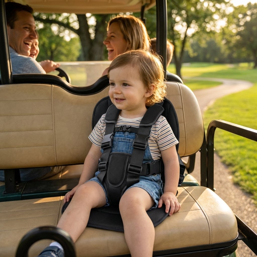 Child safely seated in golf cart with harness